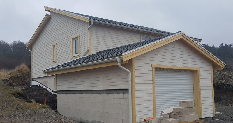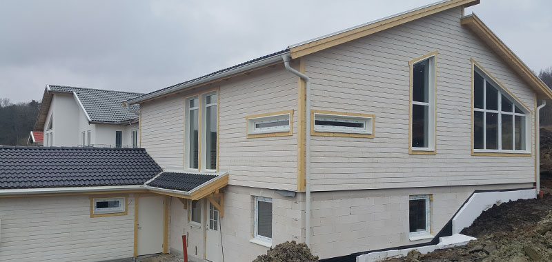 Montažna kuća građena u klasičnom skandinavskom stilu, sa drvenom fasadnom oblogom bele boje. Planirani završetak gradnje je mart 2016.