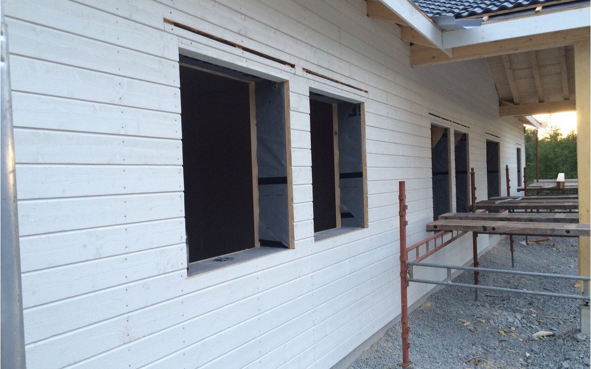 Fasada na montažnoj kući je rađena u skandinavskom stilu, sa horizontalno postavljenom drvenom fasadnom oblogom. Fasadna obloga je bele boje.
